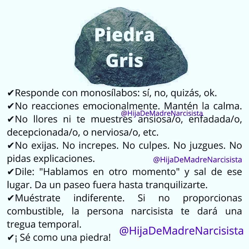 La técnica de la piedra gris es un enfoque que consiste en mantener una actitud emocionalmente neutral y apática frente a las provocaciones de una persona narcisista. Al igual que una piedra gris que no llama la atención, el objetivo de esta técnica es ser «invisible» en el sentido emocional, evitando alimentar el ego del narcisista. En lugar de entrar en discusiones o dramas emocionales, se busca desviar la atención de la persona narcisista hacia otra dirección.